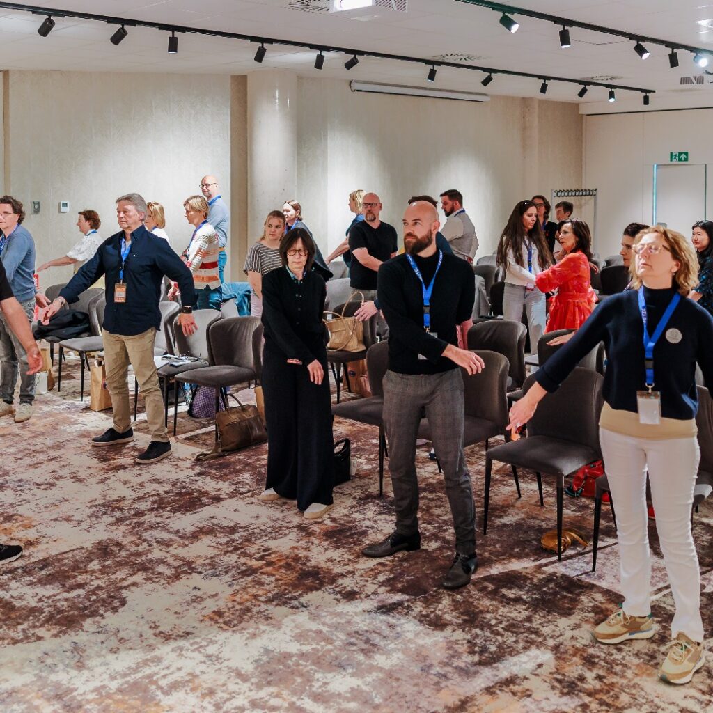 Deelnemers voeren HypnoQiGong-bewegingen uit tijdens een live demonstratie op het Hypnotic-congres in Gent, 2025.